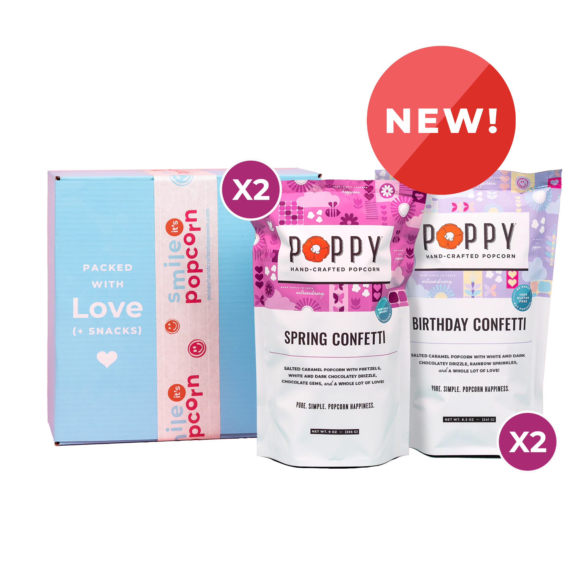 Two Birthday Confetti popcorn bags and two Spring Confetti popcorn bags packed with white crinkle in a colorful box.