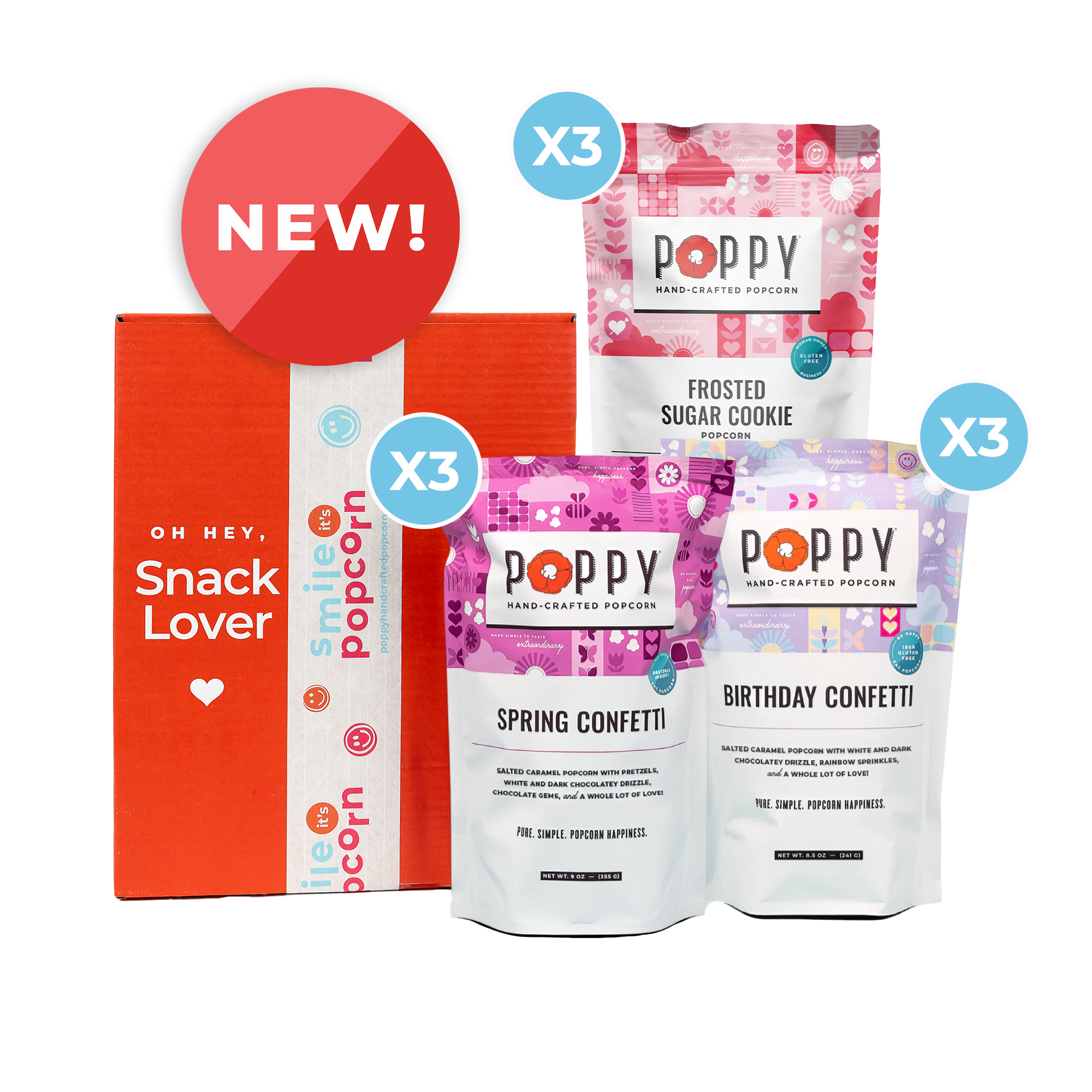 Three Birthday Confetti popcorn bags, three Spring Confetti popcorn bags, and three Frosted Sugar Cookie popcorn bags.