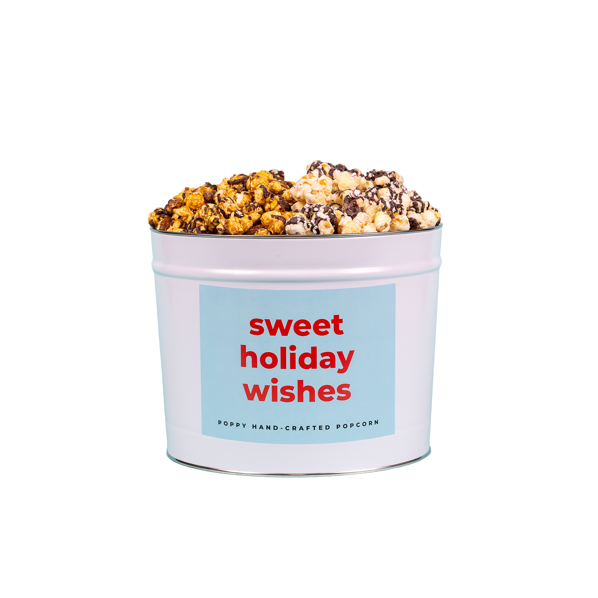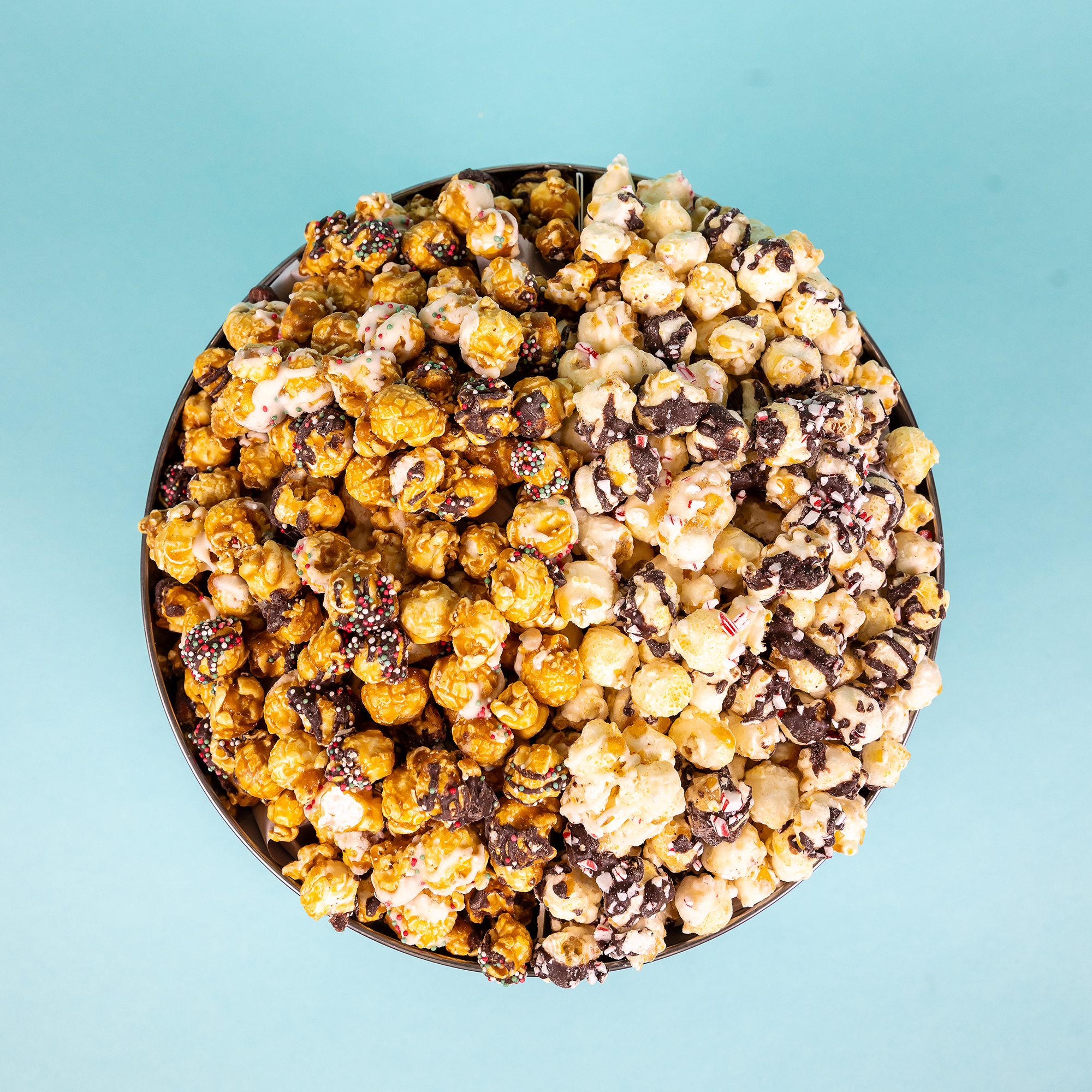 Your choice of two holiday popcorn flavors side-by-side in a medium tin, perfect for sharing or gifting.