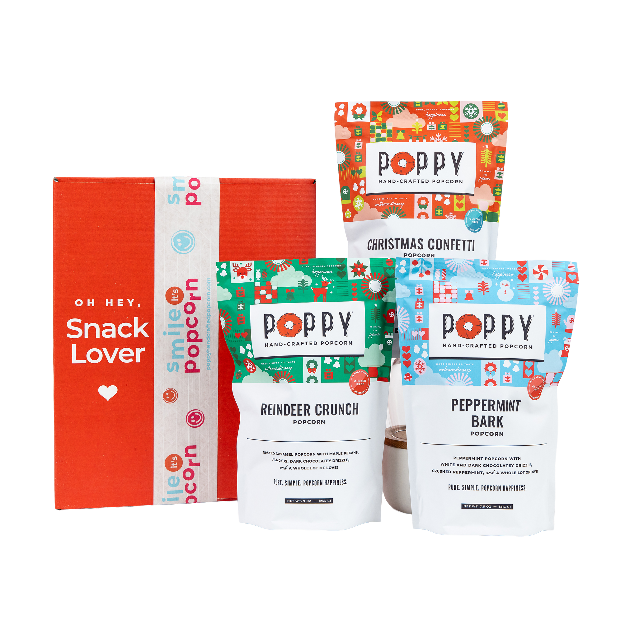 A festive trio that’s full of flavor. This gourmet popcorn gift set features three holiday favorites: Peppermint Bark, peppermint popcorn with crushed candy and chocolatey drizzle, Reindeer Crunch, salted caramel popcorn with caramelized nuts and chocolatey drizzle, and Christmas Confetti, salted caramel popcorn with chocolatey drizzle and colorful nonpareils.