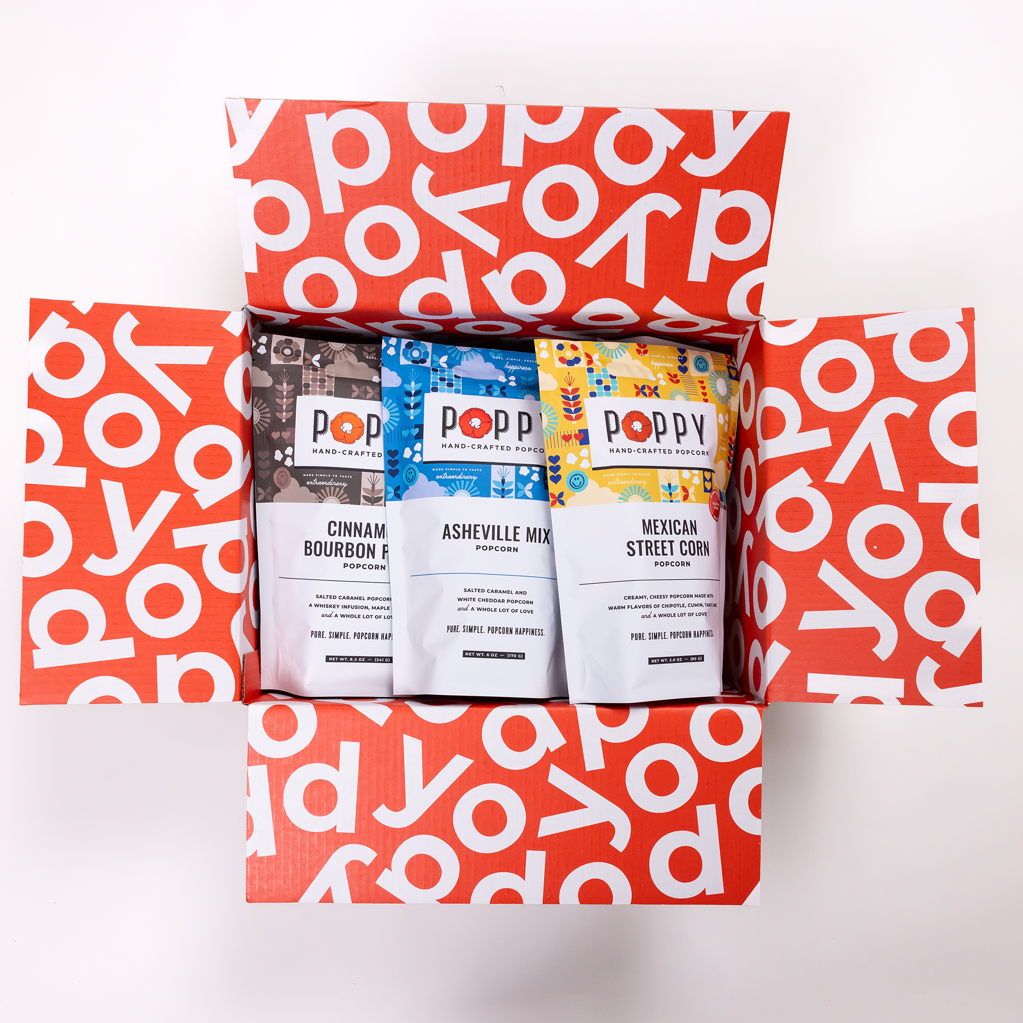 Press play and pass the popcorn. Three bags each of Asheville Mix, Mexican Street Corn, and Cinnamon Bourbon Pecan.