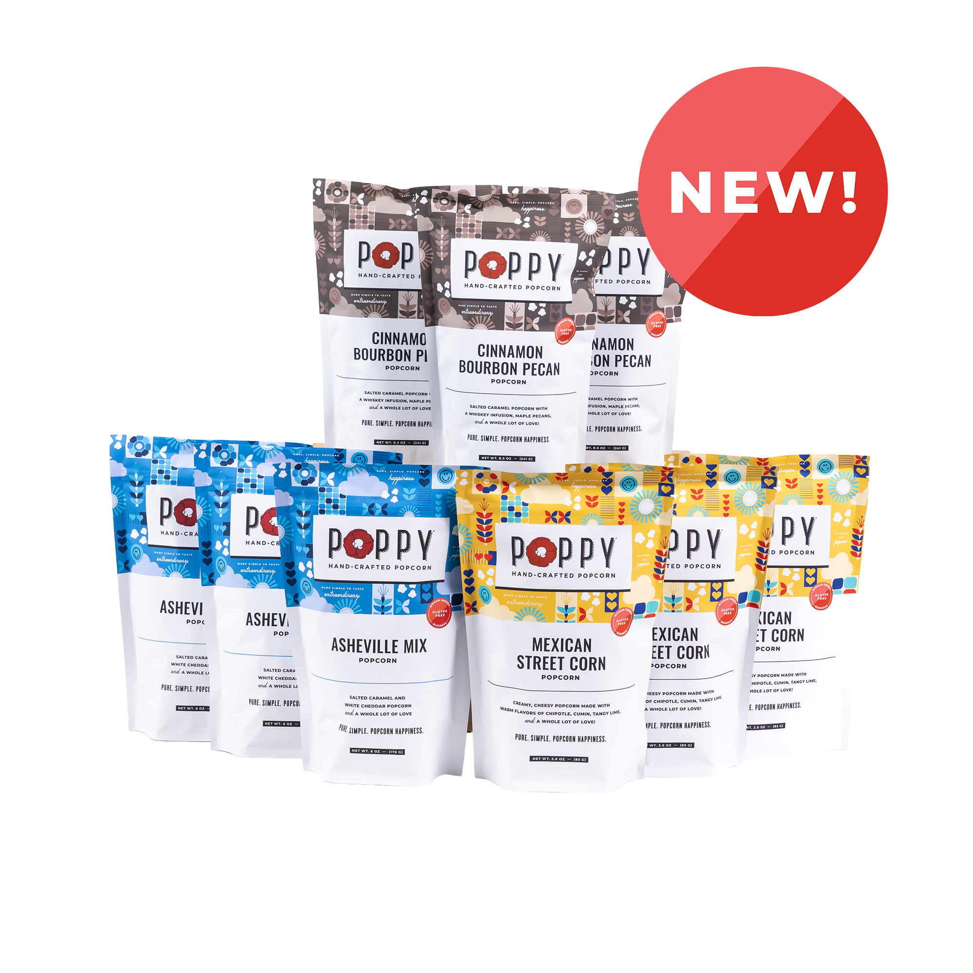 Asheville Mix, Mexican Street Corn, and Cinnamon Bourbon Pecan come together in a nine-bag lineup built for movie nights. The classic concession stand snack, with a twist.